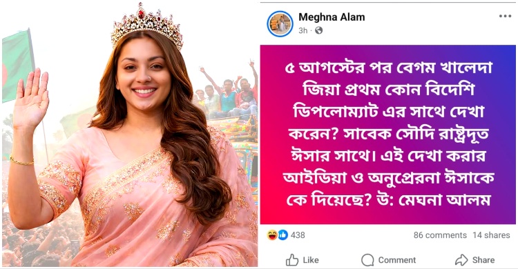 সোমবার (৯ ফেব্রুয়ারি) নিজের ফেসবুকে এক পোস্টে আবারও সেই সৌদির সাবেক রাষ্ট্রদূতের বিষয়টি আলোচনায় এনেছেন। সেখানে তিনি লেখেন, ‘৫ আগস্টের পর বেগম খালেদা জিয়া প্রথম কোন বিদেশি ডিপলোম্যাটের সঙ্গে দেখা করেন? সাবেক সৌদি রাষ্ট্রদূত ঈসার সঙ্গে। এই দেখা করার আইডিয়া ও অনুপ্রেরণা ঈসাকে কে দিয়েছে? উত্তর: মেঘনা আলম।’
