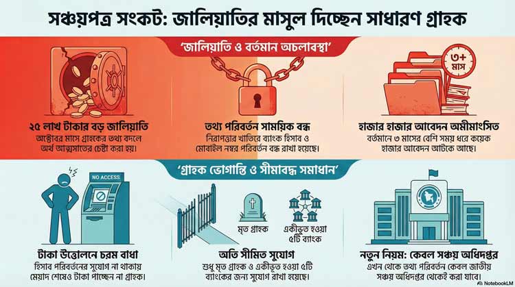 জাতীয় সঞ্চয়পত্র নিরাপদ বিনিয়োগের প্রতীক। অবসর জীবনের ভরসা, অসুখ-বিসুখে শেষ আশ্রয়। কিন্তু সেই সঞ্চয়পত্রই এখন বহু গ্রাহকের জন্য দুশ্চিন্তার কারণ হয়ে দাঁড়িয়েছে। একটি জালিয়াতির ঘটনার পর নিরাপত্তা জোরদার করতে গিয়ে বন্ধ করে দেওয়া হয়েছে ব্যাংক হিসাব ও মোবাইল নম্বর পরিবর্তনের প্রক্রিয়া। এতে বৈধ গ্রাহকদের বড় একটি অংশ পড়েছেন চরম দুর্ভোগে।