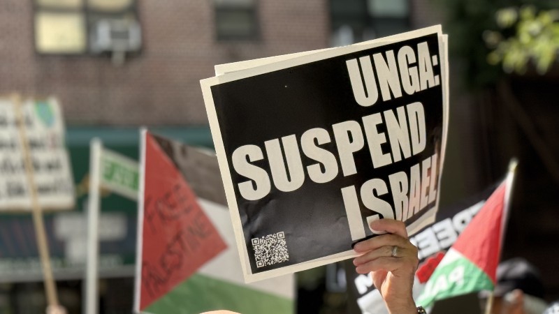 জাতিসংঘের ৮০তম সাধারণ অধিবেশনের মধ্যেই গাজায় ইসরাইলী আগ্রাসনের বিরুদ্ধে জাতিসংঘ সদর দপ্তরের সামনে তীব্র বিক্ষোভ অনুষ্ঠিত হয়েছে। স্থানীয় সময় দুপুর ১২টা থেকে শুরু হওয়া এ বিক্ষোভে শত শত প্রবাসী ফিলিস্তিনি, মানবাধিকার কর্মী ও শান্তিকামী মানুষ অংশ নেন।