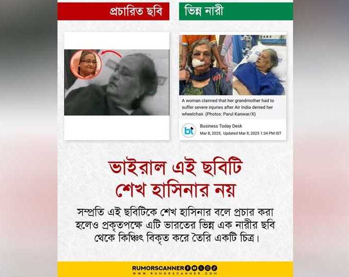 তবে পরবর্তীতে ছবিটির সঙ্গে প্রচারিত দাবি ভুল ও বিভ্রান্তিকর হিসেবে শনাক্ত হয়েছে। ছবিটি আসলে শেখ হাসিনার নয়, ভারতের এক ভিন্ন নারীর। এই ঘটনায় “ডিজিটাল গুজব” বা মিথ্যা তথ্য ছড়িয়ে রাজনৈতিক ও সামাজিক অস্থিরতা সৃষ্টি হওয়ার আশঙ্কা দেখা দিয়েছে।