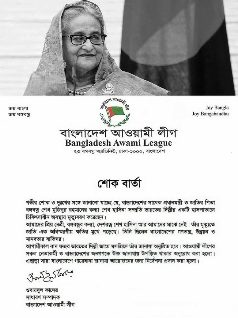 এছারাও বাংলাদেশ আওয়ামী লীগের একটি প্যাডে দলের সাধারণ সম্পাদক ওবায়দুল কাদের সাক্ষরিত শোক বাতা ছড়িয়ে পরেছে।