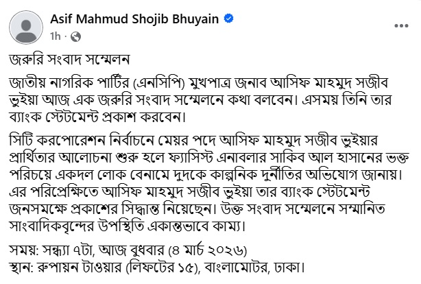জাতীয় নাগরিক পার্টির (এনসিপি) মুখপাত্র আসিফ মাহমুদ সজীব ভুঁইয়া বুধবার (৪ মার্চ) সন্ধ্যা ৭টায় এক জরুরি সংবাদ সম্মেলন ডেকেছেন।
