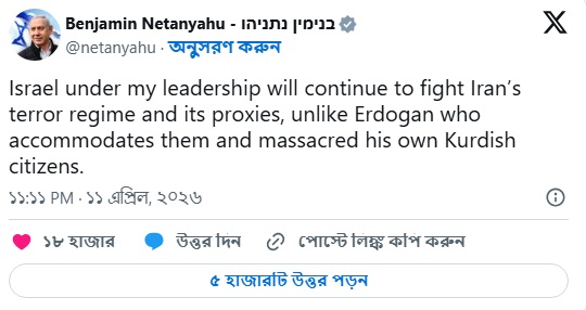 উল্লেখ্য, ইরানকে ঘিরে সাম্প্রতিক উত্তেজনার মধ্যে যুদ্ধবিরতি কার্যকর রয়েছে এবং যুক্তরাষ্ট্র ও ইরানের মধ্যে আলোচনা চলমান। এমন পরিস্থিতিতেই নেতানিয়াহুর এই মন্তব্য নতুন করে উত্তেজনা বাড়াতে পারে বলে মনে করছেন বিশ্লেষকরা।