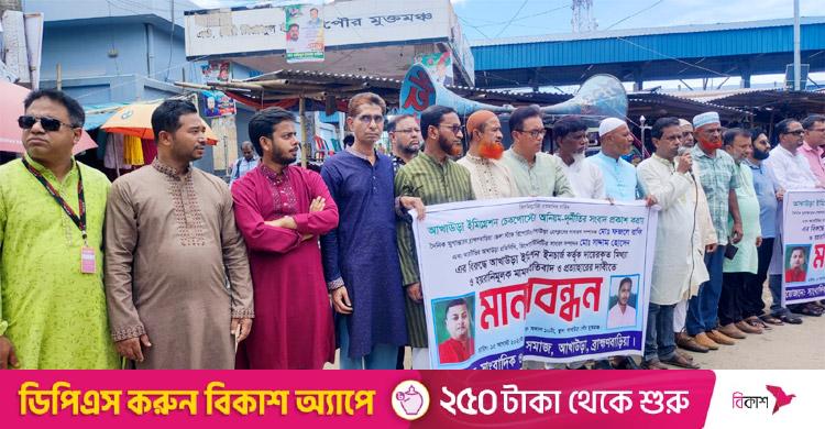 ব্রাহ্মণবাড়িয়ার আখাউড়ায় ইমিগ্রেশন চেকপোস্টের অনিয়ম-দুর্নীতির সংবাদ প্রকাশ করায় দুই সাংবাদিকের বিরুদ্ধে মামলার প্রতিবাদে মানববন্ধন অনুষ্ঠিত হয়েছে। শুক্রবার (১৫ আগস্ট) বেলা